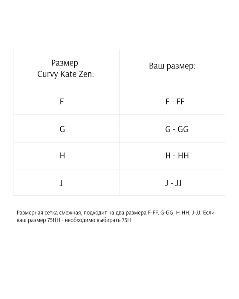 - Размерная сетка смежная, подходит на два размера F-FF, G-GG, H-HH, J-JJ