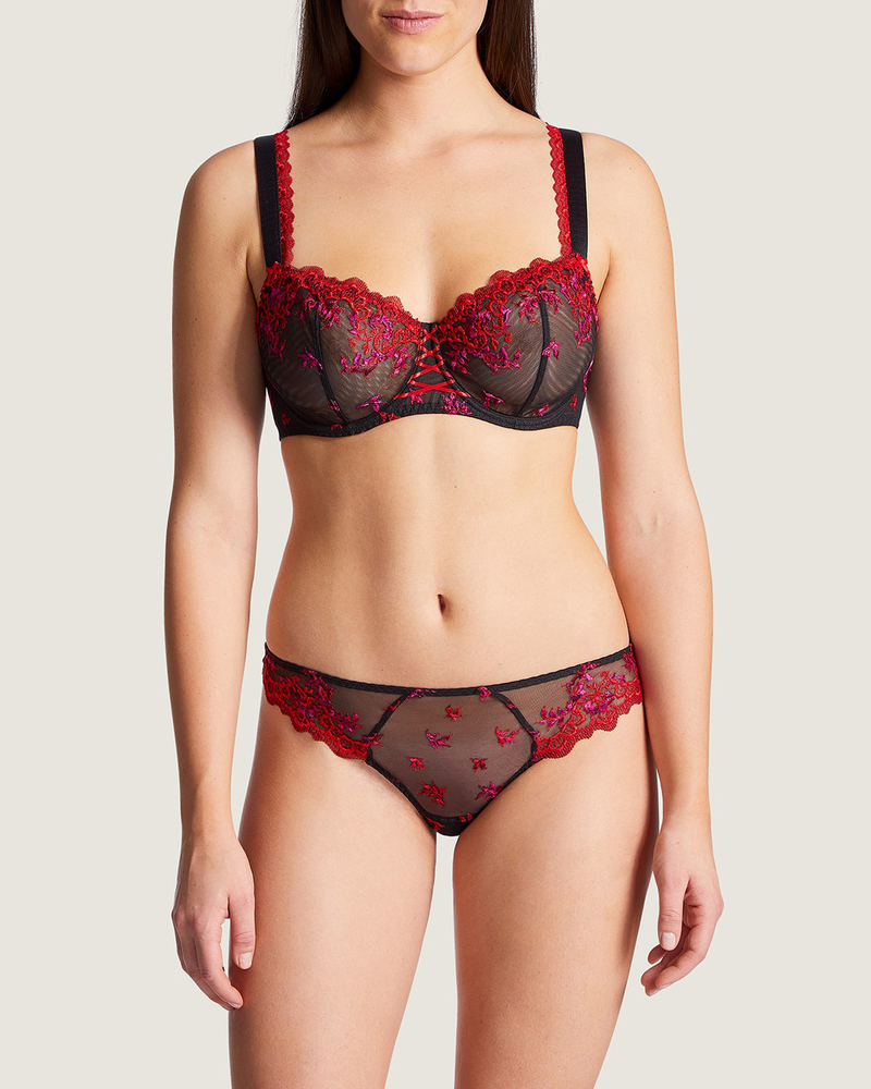 Открытое сексуальное декольте украшено изысканной цветочной вышивкой, дополненной контрастными ремешками с кружевами Valenciennes. У этого есть усиленная задняя конструкция для улучшенной поддержки.