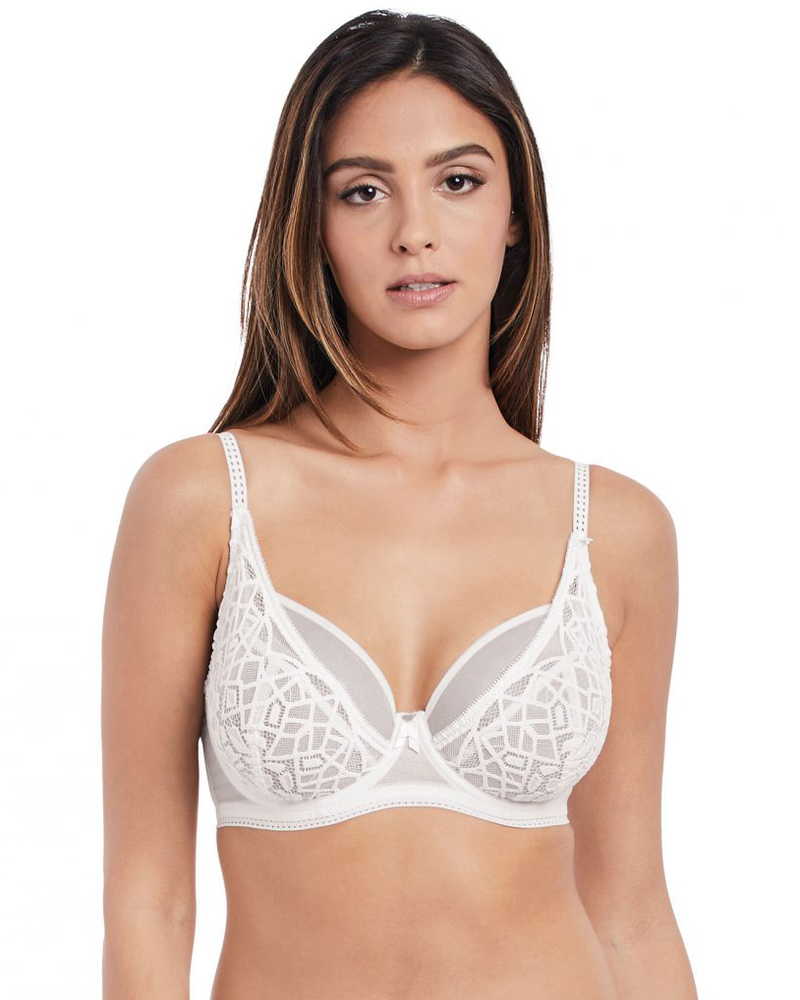 Действительно шикарная новинка от Freya. Чашечки бюстгальтера состоят из прозрачной сетчатой ткани, поверх которой прилегает слой из плотного, эластичного гипюра. С помощью этого приема визуально создается эффект открытого бюстгальтера в стиле планж. Слой кружевного гипюра создает дополнительную поддержку и собирает грудь с боков к центру, формируя открытое декольте. Бретели регулируются и декорированы поверх эластичной тесьмой.