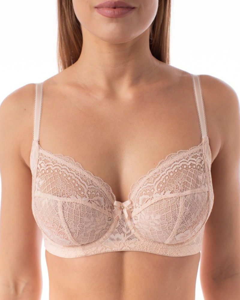 Мягкая чашка с боковым подкроем выполнена из эластичного кружева с рисунком в модных тенденциях. Боковые детали укреплены вертикальной пластиной. Украшение: бантик