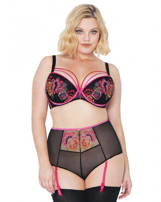 Просто потрясающий Curvy Kate Encounter в сочных цветах и сексуальными ремешками. Страпы выполнены в ярко розовом и оттенке фуксия, дополняет их кант по нижней части бюста. Чашечки украшены роскошной цветочной вышивкой с акцентом на металлизированых нитях.