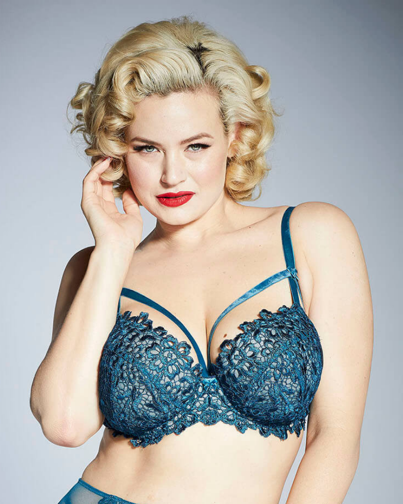 Бюстгальтер красивого синего цвета с косточками, плотный, оригинального кроя. На основу чашки наложено неэластичное шитье. Ремешки в виде формы Х и бретели выполнены из бархата. Между чашками и на бретелях бархатные бантики. Задняя баска – прозрачная сеточка с микрофибровой основой с фирменным перекрестьем Диты.