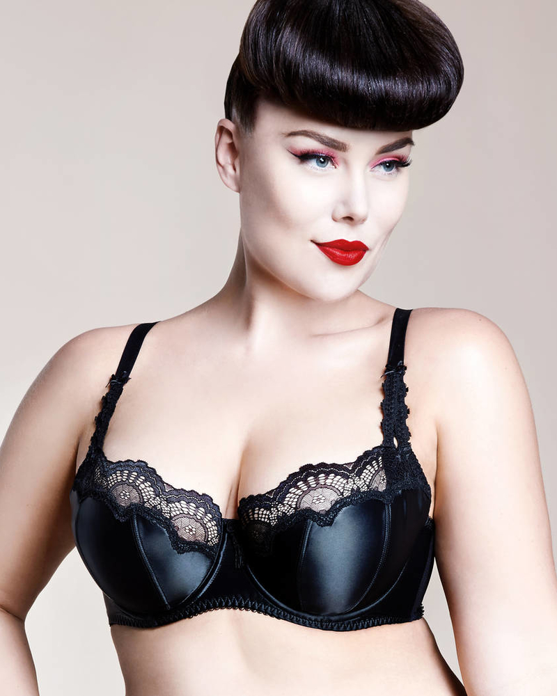 Эффектный чёрный бюстгальтер от Dita Von Teese с чашечкой халф-кап. Изящное кружево в сочетании с гладкой, атласной чашкой.