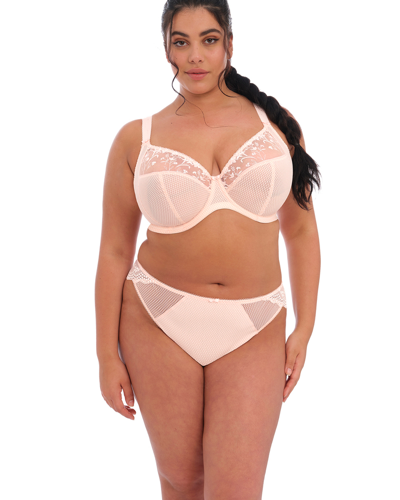 Бюстгальтер Charley Plunge, в балетно-розовом цвете, от английской марки Elomi выполнен на базе столь любимой модели бюстгальтера Matilda. Трехсекционная чашка с боковым подкроем является гибридом, т.к. сосчитает в себе форму планж и full cap. Основание чашки выполнено из двойной сетки с геометрическим рисунком. Верхняя часть дополнена эластичной вставкой с нежной, цветочной вышивкой и гибкой резинкой для оптимальной фиксации груди. Низкая перемычка обеспечивает максимальное прилегание к телу. Бретели гладкие, регулируются по всей длине, дополнены подвижным креплением на J-образном крючке, которое позволяет зафиксировать их на спине в положении «крест на крест», тем самым максимально собирая грудь к центру, разгружая плечи и спину. По комфортности эта модель бюстгальтера приравнивается к спортивному белью. Модель минимизирует грудь и выглядит нейтрально под одеждой.
