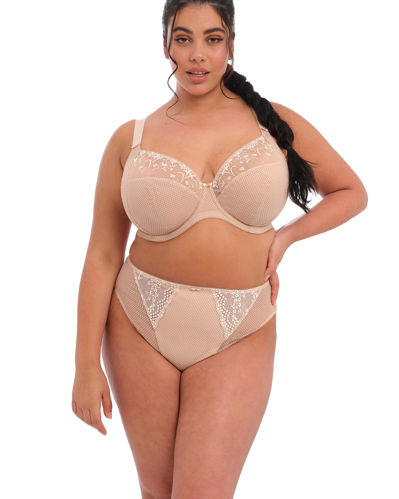 Бюстгальтер Charley Plunge, в красивом палевом оттенке, от английской марки Elomi выполнен на базе столь любимой модели бюстгальтера Matilda. Трехсекционная чашка с боковым подкроем является гибридом, т.к. сочетает в себе форму планж и full cup. Основание чашки выполнено из двойной сетки с геометрическим рисунком. Верхняя часть дополнена эластичной вставкой с нежной, цветочной вышивкой и гибкой резинкой для оптимальной фиксации груди. Низкая перемычка обеспечивает максимальное прилегание к телу. Бретели гладкие, регулируются по всей длине, дополнены подвижным креплением на J-образном крючке, которое позволяет зафиксировать их на спине в положении «крест на крест», тем самым максимально собирая грудь к центру, разгружая плечи и спину. По комфортности эта модель бюстгальтера приравнивается к спортивному белью. Модель минимизирует грудь и выглядит нейтрально под одеждой.