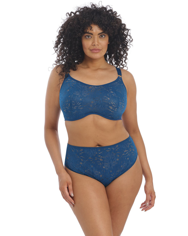 Следуя полюбившемуся тренду "нижнее белье на виду", коллекция Kelsey от Elomi - это инновационный дизайн, и этот бюстгальтер черного цвета не исключение! Данный бюстгальтер выполнен на мягкой основе, на мягких костях,подстраивающихся под основание груди, в виде полуспортивного топа, что делает его уникальным. Внутренняя часть чашки в цвете кофе с молоком сшита по типу полюбившейся Matilda- низкая перемычка, закрытая неэластичная чашка, которая отлично зафиксирует грудь с боков и окажет нужную и должную поддержку даже на чашку JJ! Внешняя часть чашки сшита из плотного эластичного кружева, иммитируего тропические листья. На кружеве присутствуют два вертикальных плоских шва, которые поднимают грудь на нужную высоту, но при этом визуально минимизируют ее. Kelsey прекрасно подойдет под тонкий трикотаж, так как бюстгальтер в этом случае окажется совсем незаметным! А для самых смелых этот бюстгальтер можно надевать даже под пиджак! Нижний край имеет мягкую, подстраивающуюся под тело резинку, которая обеспечит комфорт в течение всего дня. Широкий пояс бюстгальтера выполнен из двойной сетки: Внешняя является продолжением кружева, а внутренняя более плотная, позволит поясу длительное время не терять свою Эластичность. Огромный плюс Kelsey - наличие J-образного крючка. Именно он снимет нагрузку на плечи и предотвращает спадание бретель. Застёжка в зависимости от размера чашки бывает 2-ух и 3-х уровневая. Внутрення часть застёжки и края ,которые прилегают к телу обработаны таким способом, чтобы во время носки ощущение застёжки на спине отсутствовало.