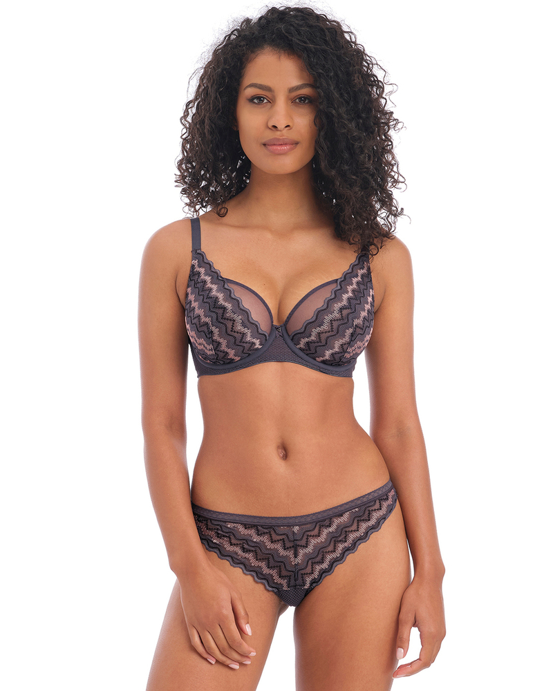 Заявите о себе с помощью бюстгальтера Freya Festival Vibe High Apex в цвете Cinder Grey с полупрозрачными верхними чашками и шикарным геометрическим зигзагообразным дизайном. Форма бюстгальтера планж создает красивое, глубокое декольте, отделанное красивой лентой и треугольными металлическими деталями.