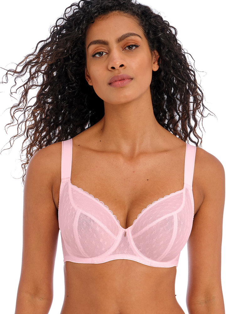 Базовая модель бренда Freya с бесшовными чашками и кокетливым вырезом в цвете Barely Pink. Элегантный дизайн с декором из кружева идеально подойдет для обновления повседневного гардероба.