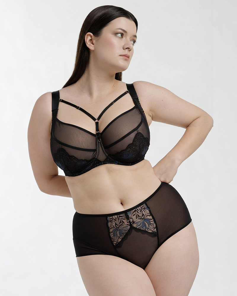 Модель балконет с Т-образной вытачкой выполнена на базе модели Vivietta с декоративными съёмными стрепами. Основная ткань бюстгальтера - двойная полиамидная сетка с плетением "пчелиные соты". Внешняя сторона в черном цвете, а внутренняя сторона в нюдовом цвете, благодаря такому сочетанию бюстгальтер внешне выглядит тонким и невесомым и при этом имеет высокую степень коррекции и поддержки. Край чашки с внешней и внутренней стороны обработан черной окантовочной резинкой для идеальной посадки при асимметрии или при незначительном изменении размера груди, а диагональная вытачка с внешней стороны обработана аналогичной тесьмой, такое грамотное сочетание со декоративными стрепами придаёт бюстгальтеру сексуальности и его уже можно отнести в раздел будуарного белья. Нижние части чашки декорированы кружевом с элементами люрекса. Бретели широкие, гладкие с внешней стороны с сатинированной выработкой, с внутренней стороны мягкая бархатистая поверхность. Пояс бюстгальтера средней ширины, выполнен из одинарной ткани powernet средней степени коррекции. По верхней части пояса также дополнительно прошита бретельная лента для усиленной поддержки. Во всех размерах также 3-уровневая застёжка повышенной комфортности.