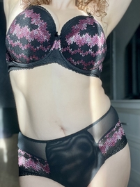 Все понравилось! Правда, калькулятор предлагал на объем под грудью взять пояс 75 (при обхвате 85), взяла 80 и не прогадала. В чашке все хорошо уместилось. Красивый получился комплект, к зиме, как будто вязаный принт. Спасибо!