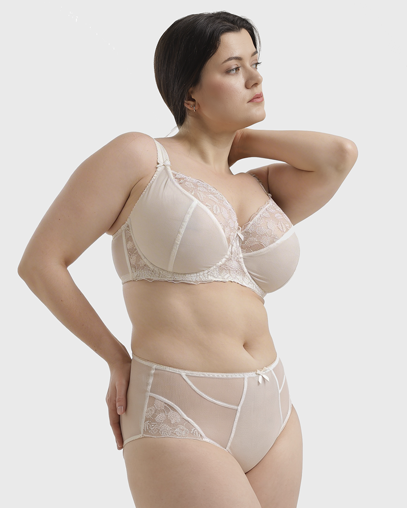Эффектный кружевной бюстгальтер от Nessa в кремовом оттенке. Бюстгальтер-балконет с кружевной чашкой дополнен золотистой ниткой, добавляя модели женственности. Плотный пояс из корсетной сетки обепечивает надежную поддержку груди до чашки J.