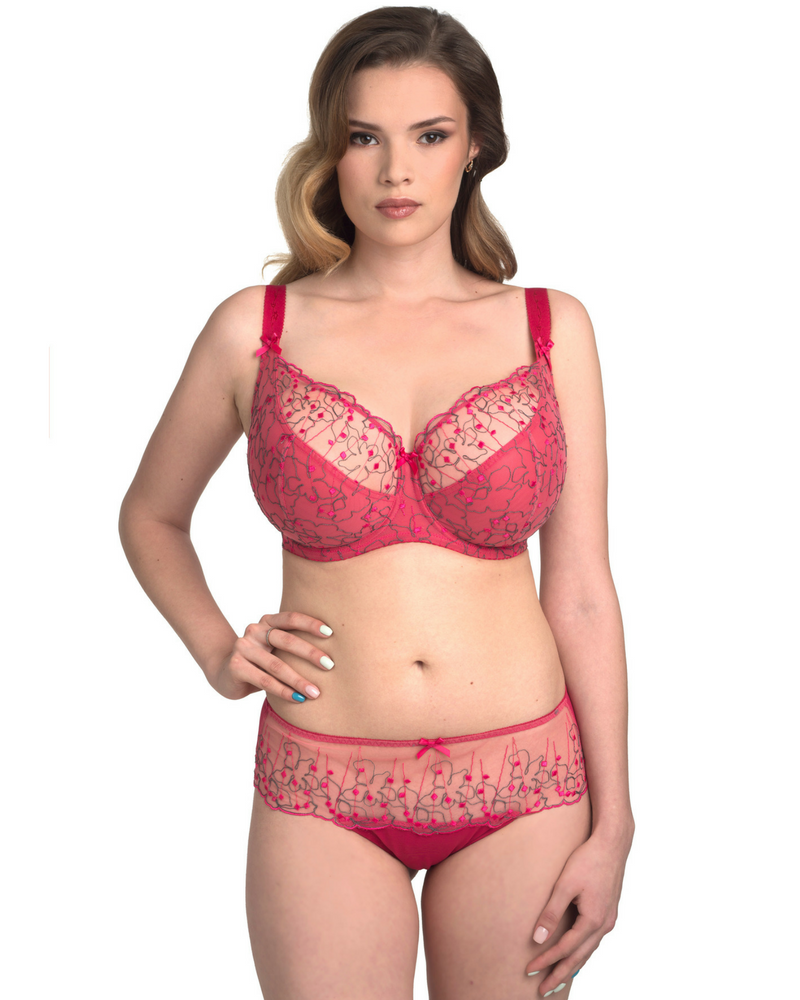 Стильная летняя модель в потрясающе красивом малиновом цвете прекрасно округляет и приподнимает бюст. Полностью расшитая гипюровая чашка, неэластичная сетка поверх чашек и завышенный боковой подкрой идеально убирает "бочка". Плотный пояс на 3 крючка обеспечивает надежную поддержку тяжелой груди.