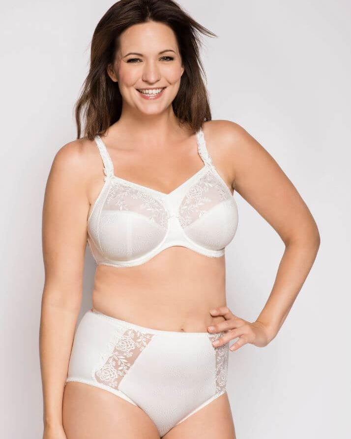 Модель Ella H+ в молочном цвете - иделальный фул-кап для большой груди. Она отличается от модели Ella эластичным жаккардовым ограничителем по линии кружева, который обеспечивает дополнительную фиксацию груди. Выполнена из мягкого эластичного жаккарда с добавлением уникального запотентованного микроволокна meryl, которое обладает повышенной прочностью, отлично тянется, идеально подстраивается под форму груди, но при этом не подвергается деформации. Бюстгальтер состоит из трех частей. Высокий боковой подкрой из мерила максимально собирает грудь с боков даже самой большой и тяжелой груди. Широкие нестандартные жаккардовые бретели отличают все модели бренда Ullа от других марок. Они очень мягкие и не перерезают плечи. Широкая спинка из двойной плотной микрофибры прекрасно держит грудь и скрывает не эстетичные "валики" на спине. Бюстгальтер декорирован нежным алансонским кружевом, плавно. переходящим с края чашки на бретели.