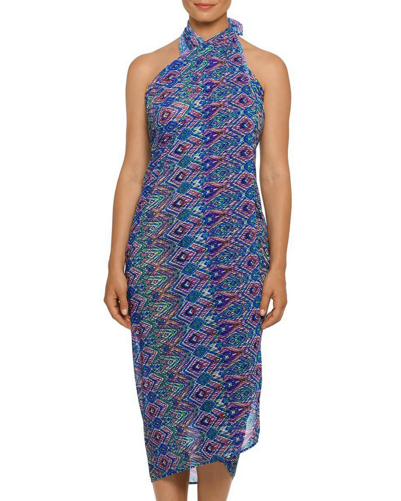 Красочное парео с геометрическим принтом подходит для любых купальников как элегантное дополнение.