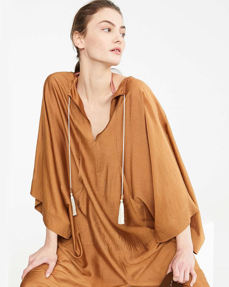 Платье из легкого шелкового материала каплевидным вырезом горловины и завязками-кисточками спереди. Свободные рукава-кимоно до локтя и карман в передней части платья.
