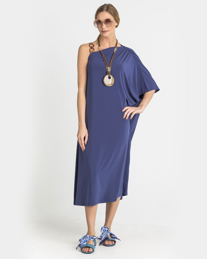 Платье тёмно-синего цвета со свободным вырезом. Лёгкая плиссировка на одном плече, на другом - декоративная полоска с украшением. Дополнительно платье украшает маленький хрусталик на плече. Изготовлено из высококачественной ткани, приятной на ощупь. Длина миди.