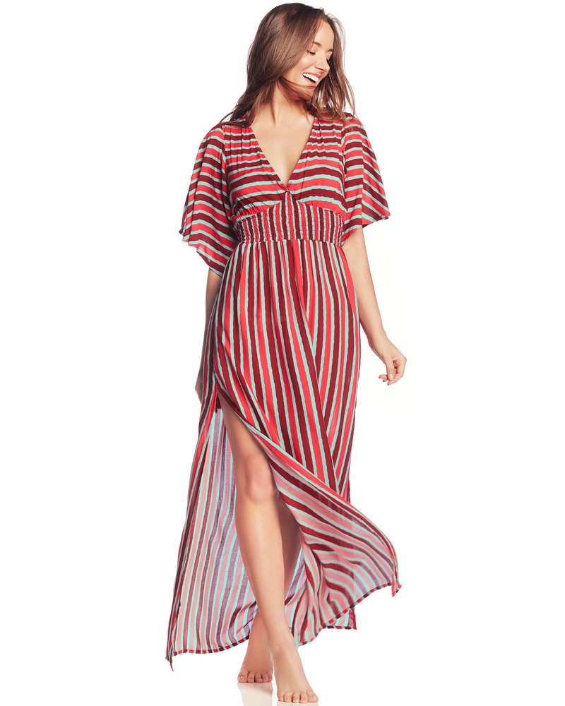 Длинное платье в стиле бохо. Пояс на талии с резинкой. Свободный крой с вырезами на юбке по бокам