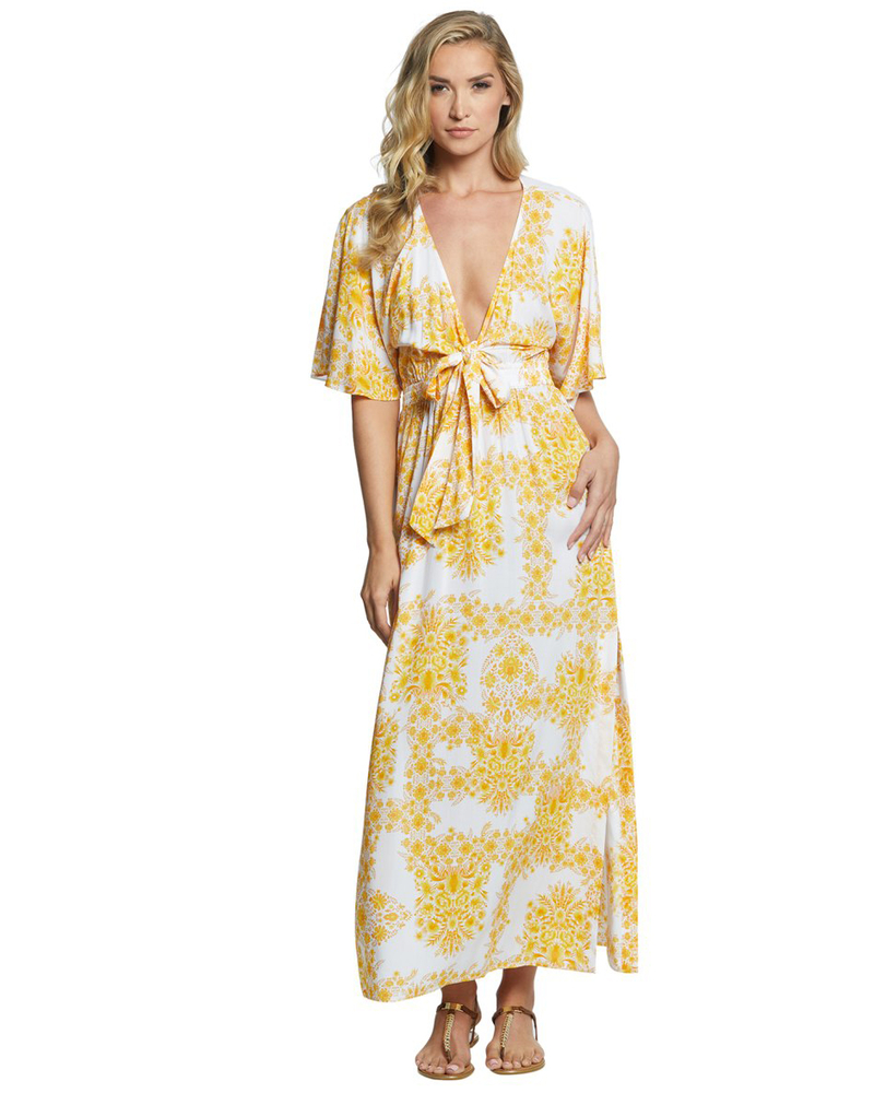 Легкое, летнее женское платье Seafolly в классическом стиле и длине макси. Яркий, цветочный принт в жёлтом цвете. Платье завязывается на поясе спереди.