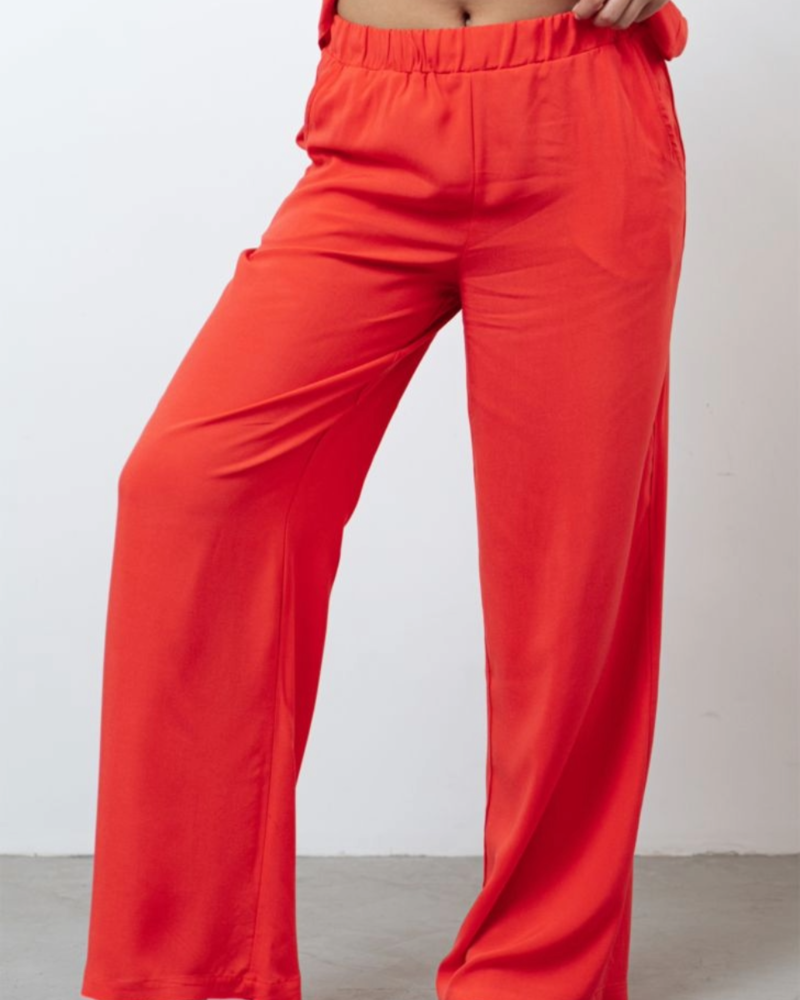 Легкие брюки из 100% вискозы. Модель прямого кроя с прорезными карманами и комфортным поясом на резинке.