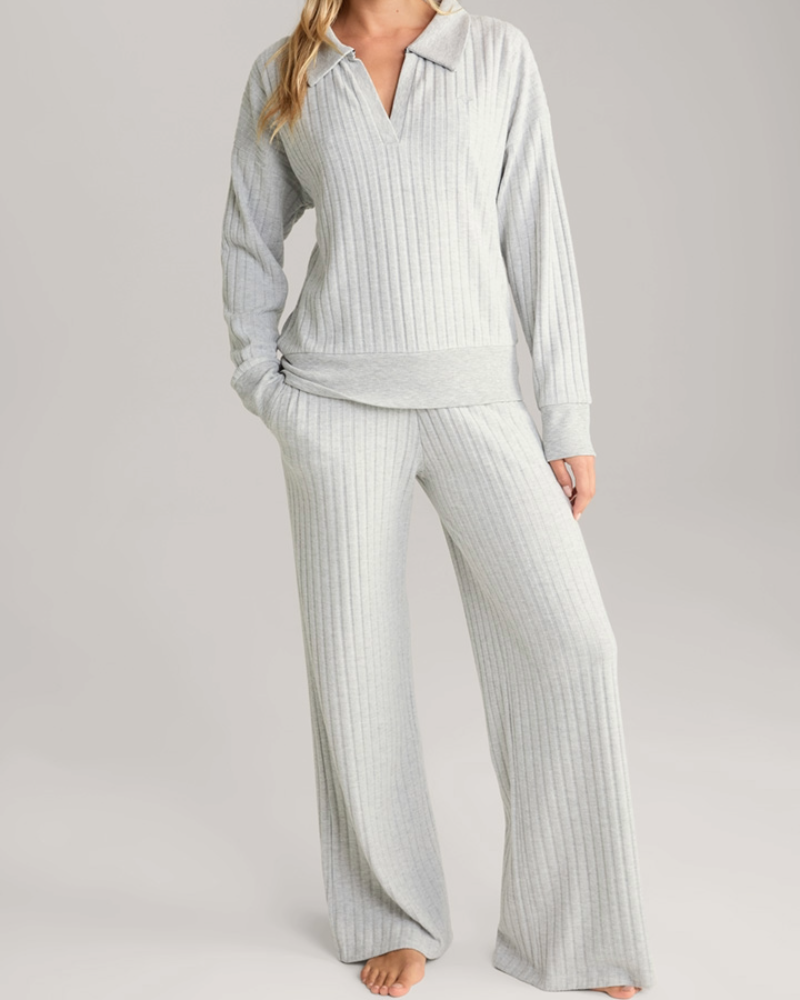 Брюки из мягкого трикотажа в рубчик с эластичным поясом. Боковые карманы с разрезами и широкий силуэт брюк дополнит повседневный образ.