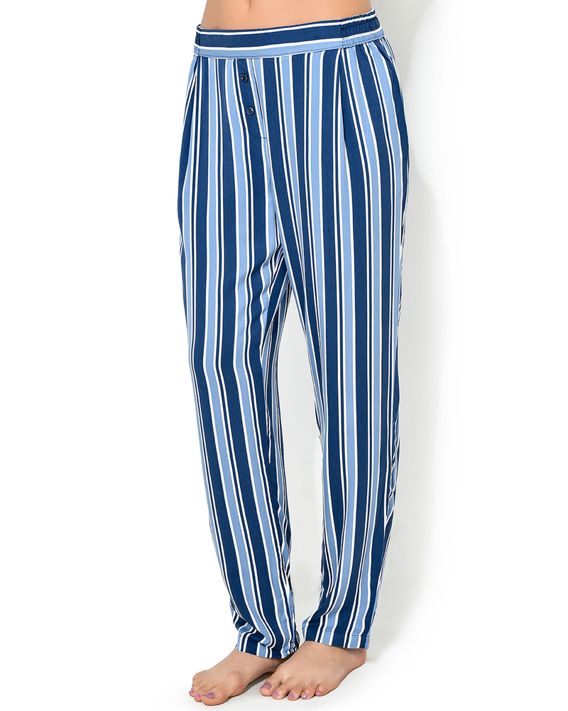 Женские домашние брюки Mey из вискозы - легкого и приятного на ощупь текстиля в вертикальную полоску. Свободный силуэт, зауженный крой, комфортный пояс на резинке, два боковых кармана, декоративная застежка спереди.