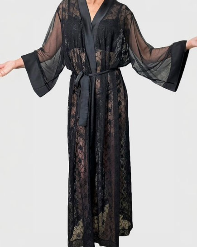 Длинный женский пеньюар с поясом. Выполнен из элегантного нежного кружева с атласными вставками.