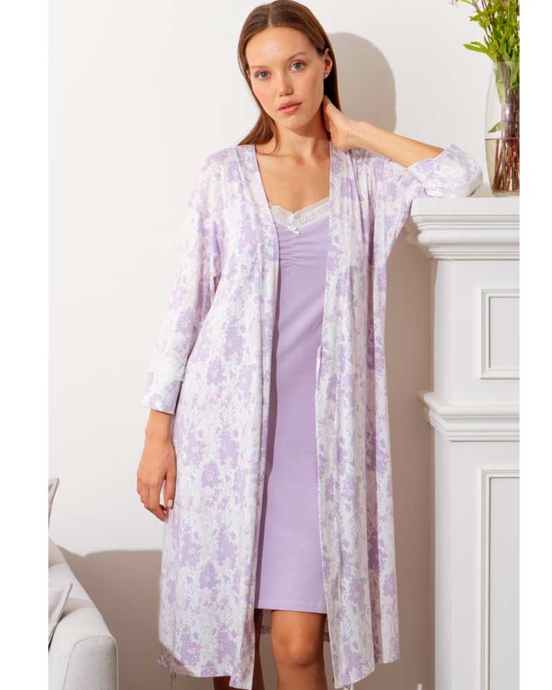Домашний пеньюар в нежном оттенке- лаванда. Элегантная длина ниже колена, с разрезами и на запахе. Рукав ¾. Пояс изделия и манжеты рукавов декорированы кружевными вставками. Линия плеча приспущена.