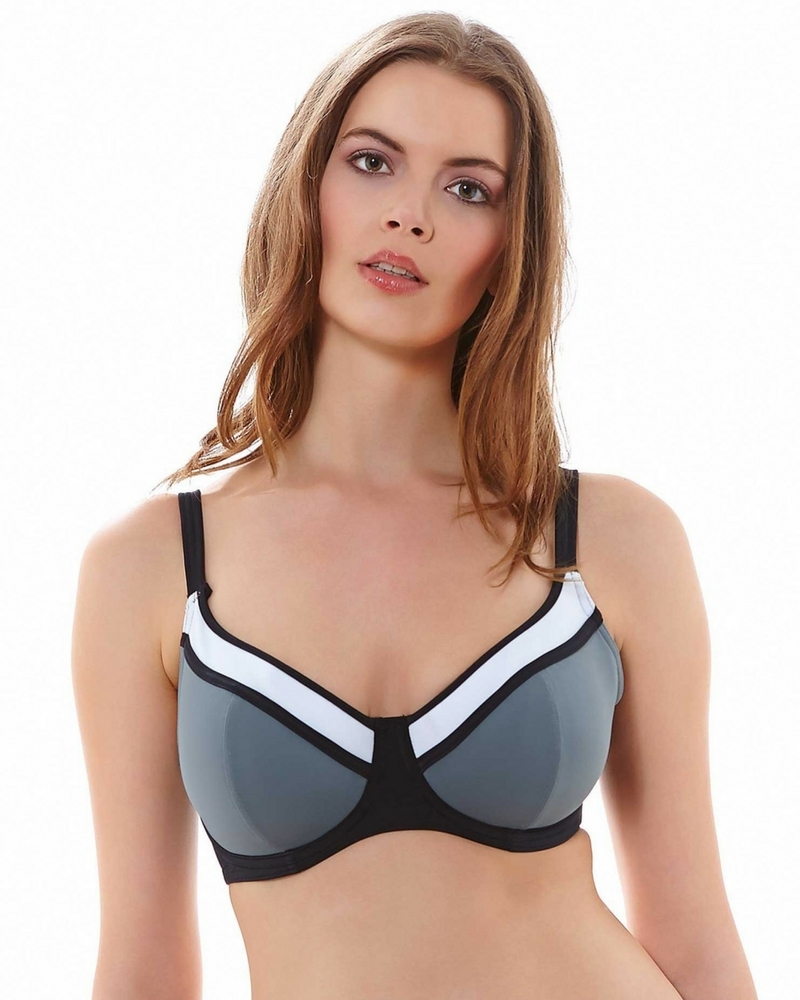 Купальник английской марки Freya, специализирующейся на больших размерах. Модель выполнена в модной расцветке «колор блок» с контрастными белыми, серыми и черными вставками. Форма «балконет» со слегка уплотненными чашечками подходит для всех типов груди. Купальник сидит также комфортно, как модели в спортивном стиле.