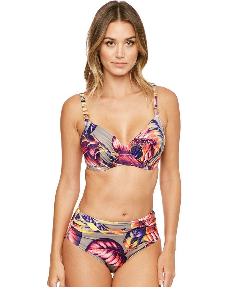 Модель Fantasie Kuramathi отличается особым удобством благодаря приятным чашечкам и классическим широким бретелям, которые обеспечивают надежную фиксацию. Боковины оснащены подкладкой из прочного тюля. Легкая сборка внизу чашечек, металлические кольца на бретелях, яркий растительный принт на сером фоне создут эффектный пляжный образ.
