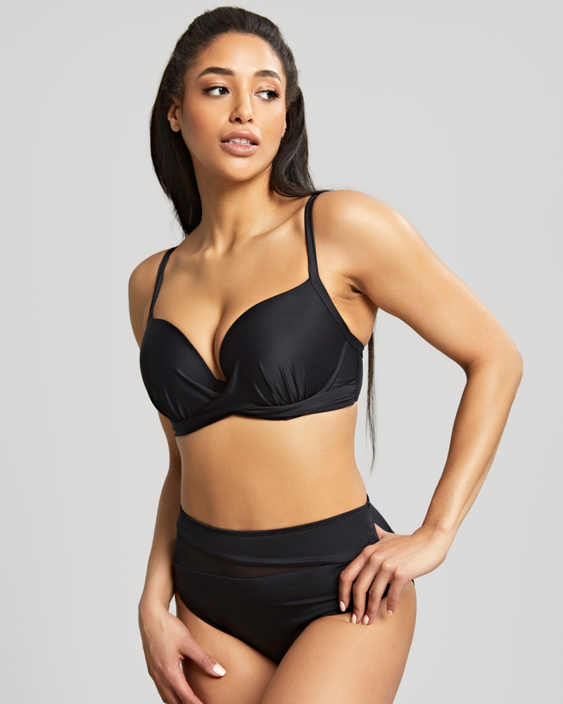 Новинка раздельного купальника от Panache в классическом черном цвете. Модель выполнена в плотной поролоновой чашке по форме планж, которая прекарасно центрирует грудь и создает пикантную ложбинку. По нижнему краю чашек проходит драпировка в виде тонкой ленты, благодаря чему грудь визуально выглядит более собранной и женственной. Бретели тонкие эластичные, регулируются по всей длине. Пояс с внутренней стороны продублирован дополнительной сеткой, с ее помощью купальник надолго сохранит свой первоначальный вид. Ширина его зависит от размера купальника. Застежка удобная, выполнена из пластика, надежно будет фиксировать пояс.