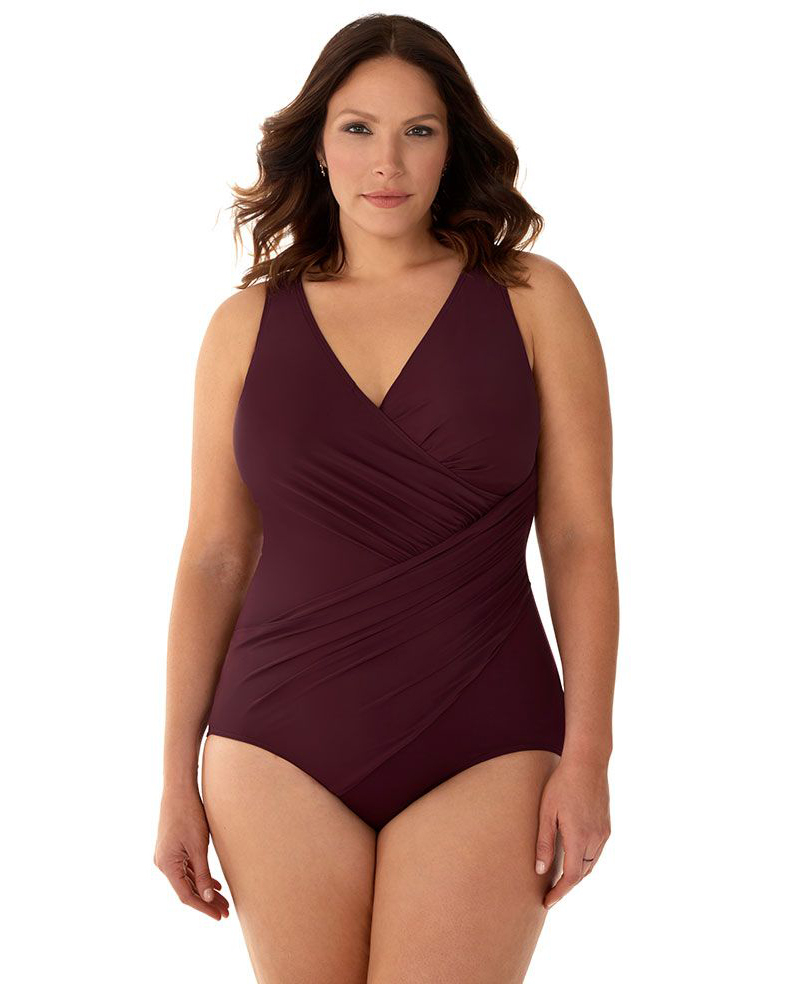 Потрясающе эффектный купальник Miraclesuit Womens Soilds в сливовом оттенке, визуально уменьшает талию и бедра благодаря лёгкой драпировке и эффекту коррекции. Глубокое декольте и линия спинки подчёркивает силуэт. Сделано из спандекса LYCRA® XTRA LIFE ™ - ткань не разрушается под действием хлора и солей.