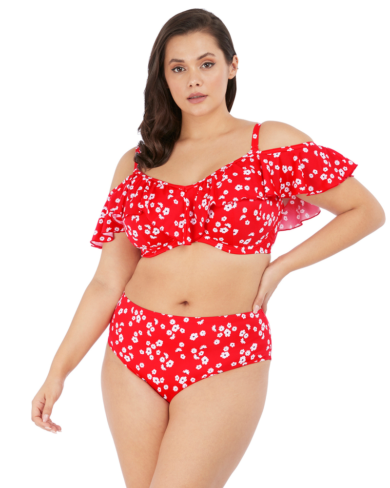 Обычный верх бикини Elomi Sailing с красивым красным цветочным принтом создает освежающую летнюю атмосферу. Верх бикини фулл-кап с узками бретелями и красивыми оборками, которые можно носить на плече или спустив с плеч.