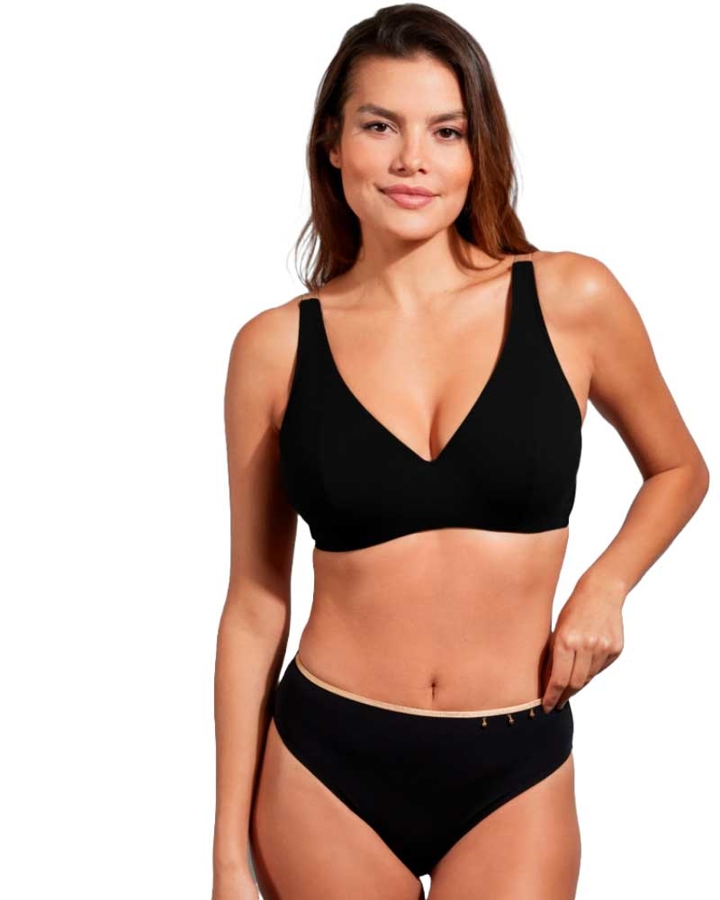 - Чашка мягкая, на косточках, хорошо закрывает и собирает грудь. V-образный вырез деликатно открывает зону декольте. Внутри чашка продублирована эластичной тканью.