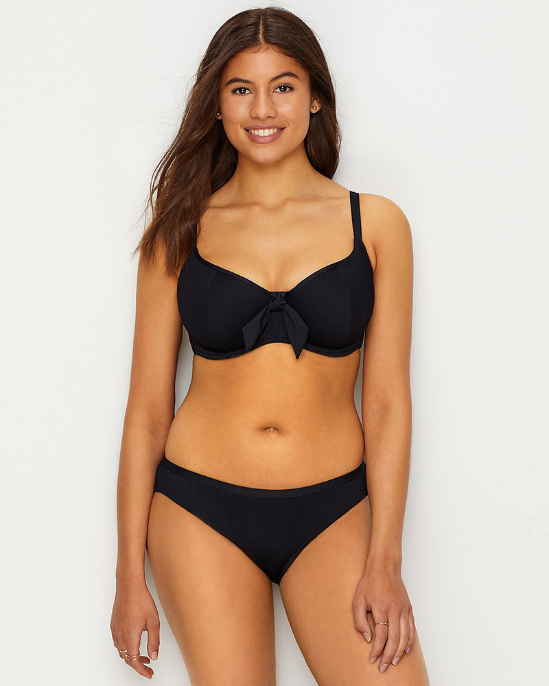 Классический текстурированный верх купальника Freya Nouveau в чёрном цвете с элегантным украшением-завязкой в морском стиле. Топ на косточках в стиле балконет обеспечивает отличную поддержку для большой груди, а боковой подкрой собирает грудь к центру и приподнимает её. Полностью регулируемые эластичные бретели, сзади пластиковая застёжка в цвет купальника.