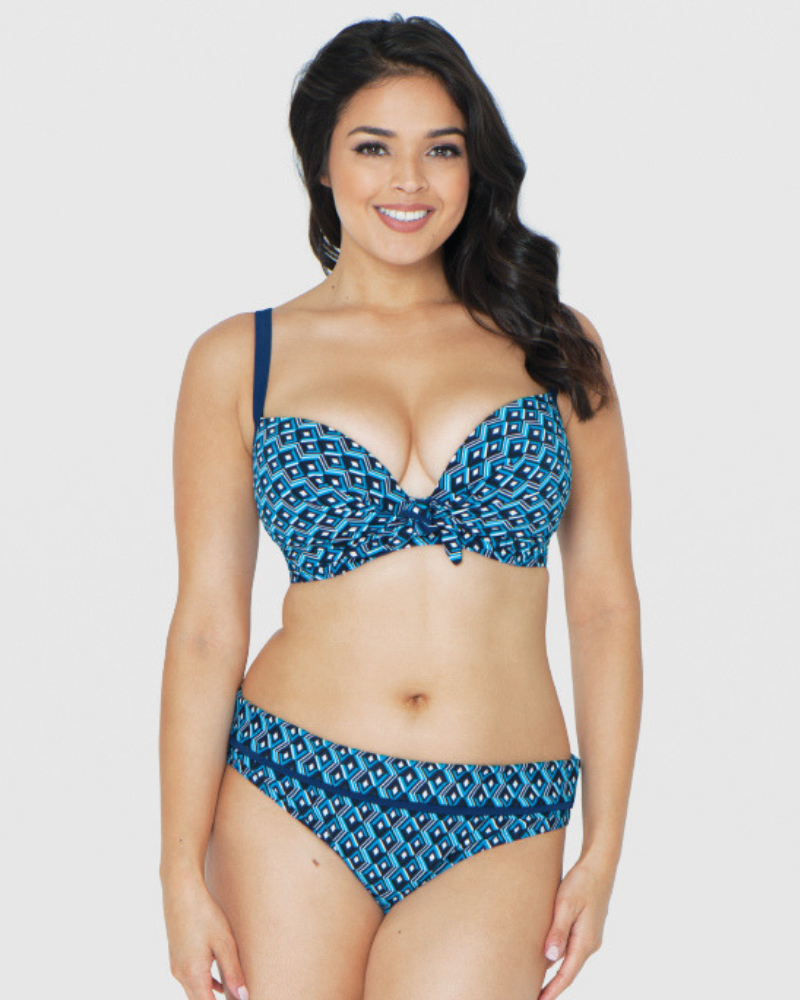 Замечательная модель купальника Wanderlust от Curvy Kate синем цвете с геометрическим принтом. Хорошо скроенная чашка в стиле “балконет” обеспечивает отличную посадку и формирует шикарное декольте. Бретели регулируются по всей длине и могут перистёгиваться по вашему вкусу: крест-на-крест, за шеей или классически прямо. Эластичный плотный пояс имеет удобную застежку синего цвета. Для полного комплекта к бра предлагаются несколько видов плавок на ваш выбор.