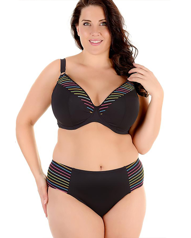 Купальник в стиле неоновых 80-х от бренда Elomi. Чашка фул-кап удерживает даже очень тяжёлый бюст. Широкие бретели регулируются по всей длине, для большего комфота есть возможность скрестить их за спиной. Купальник застёгивается на пластиковую застёжку сзади.