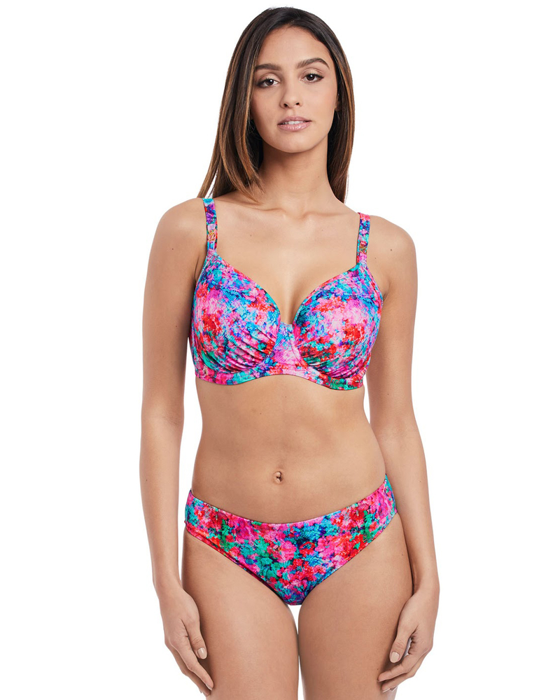Летний красивый купальник Mamba от Freya с ярким цветочным принтом хорошо приподнимает грудь и собирает к центру. Фактура ткани имитирует змеиную чешуйчатую кожу. Бра с каркасной плотной гладкой чашкой. Плотный пояс с дополнительными каркасами по бокам предохраняет от скручивания и от растяжений после купания. Бретели регулируется по длине. В комплект к бюстгальтеру вы можете выбрать плавки двух видов.