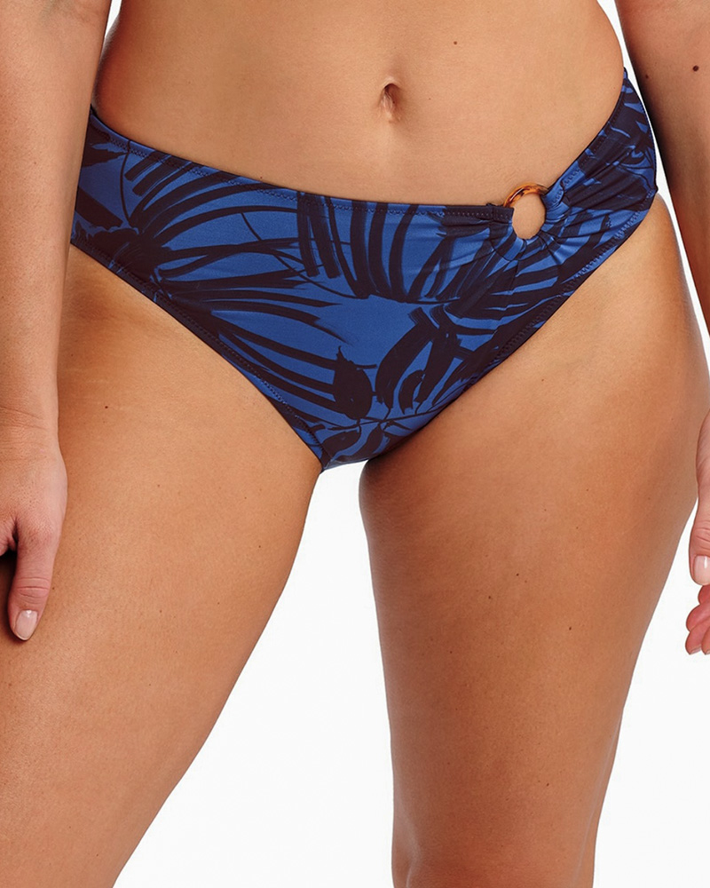 Новые трусики Malabar Coast в цвете Midnight — это гармония стиля и комфорта. Крупные пальмовые листья на благородном синем фоне создают неповторимый прибрежный вайб. Модель со средней посадкой идеально сидит на бедрах, а изящное кольцо спереди в стиле «черепаховый панцирь» становится элегантным акцентом, достойным лучших курортов.
