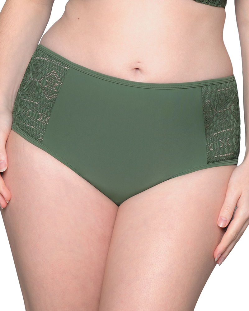 Плавки-шортики с кружевом на бёдрах с завышенной посадкой.