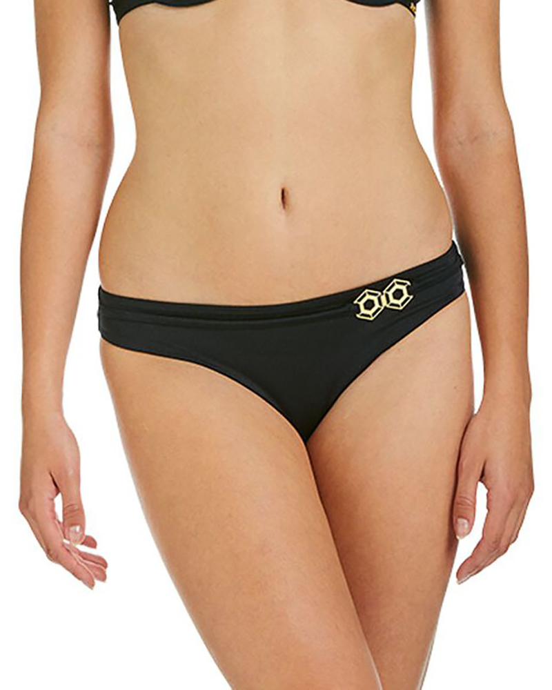 Классические плавки чёрного цвета с золотистым декором на боку.