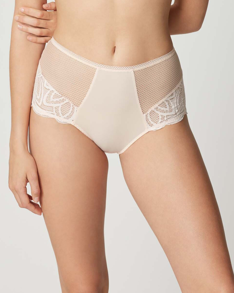 Высокие трусики нежного, пудрового оттенка дополнены крупным кружевом.