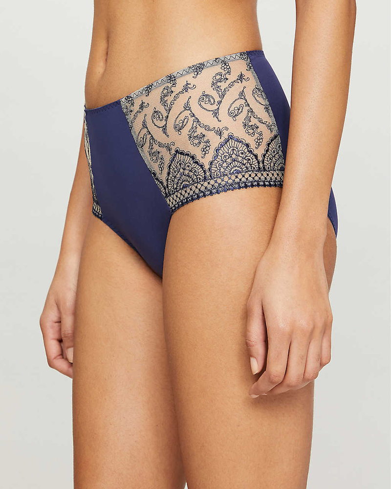 Трусики с высокой посадкой синего цвета и лёгкой вышивкой на телесной основе.
