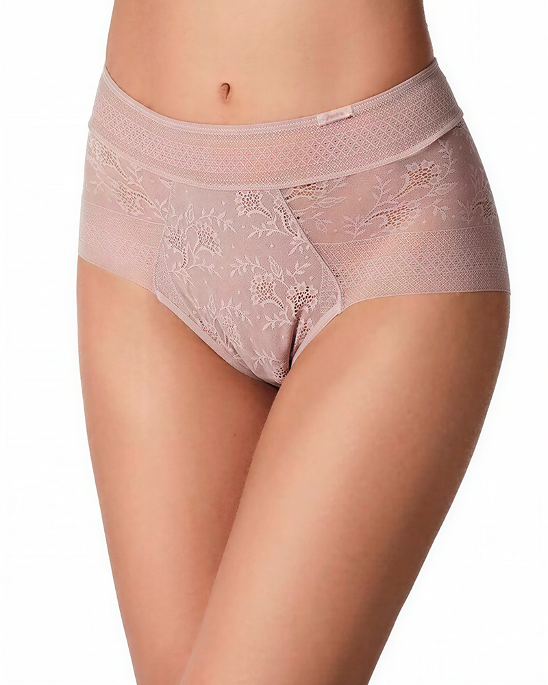 Ультратонкие высокие трусики из тонкого эластичного кружева в цветочек, с плоской резинкой на талии, незаметные под одеждой благодаря ровным, бесшовным контурам вдоль линии ягодиц.