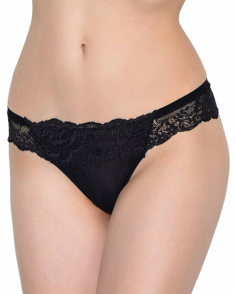 Элегантные трусики танга, с низкой линией талии. Выполнены из мягкого эластичного кружевного полотна с цветочным мотивом и вставки из гладкого эластичного полотна с микрофиброй. Верхний срез обработан плоской широкой тесьмой. Срезы проймы кружевные, с фигурными краями.