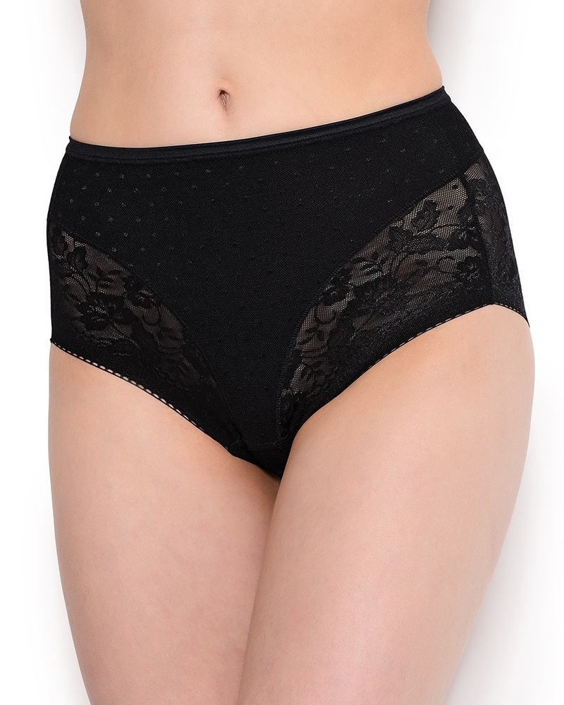 Высокие корректирующие трусы-слипы из коллекции Secrets Figure черного цвета, с сильным равномерным утягивающим эффектом в области живота, поясницы, ягодиц. Выполнены из эластичной узорчатой сетки с усиленной передней деталью и спинкой. Плоские швы. Срезы проймы обработаны плоскими фестонами.