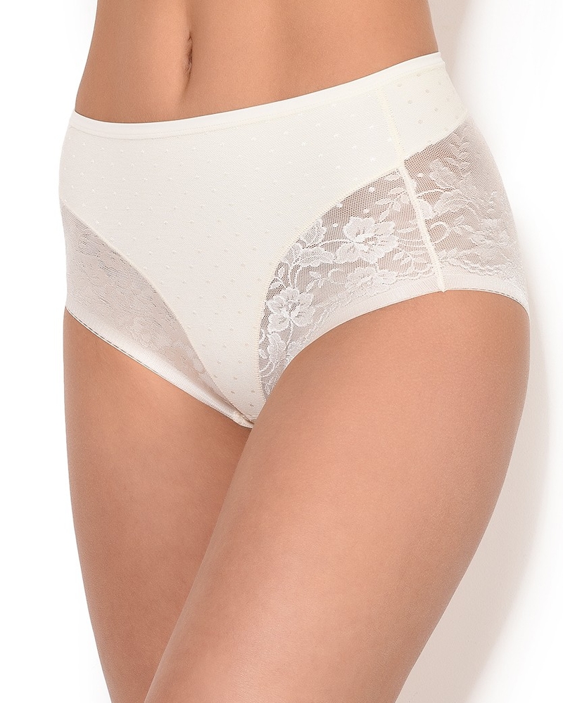 Высокие корректирующие трусы-слипы из коллекции Secrets Figure белого цвета, с сильным равномерным утягивающим эффектом в области живота, поясницы, ягодиц. Выполнены из эластичной узорчатой сетки с усиленной передней деталью и спинкой. Плоские швы. Срезы проймы обработаны плоскими фестонами.