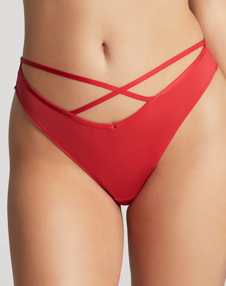 Комплектные трусы бразилиана со средней посадкой и с высоким вырезом бедра. Спереди модель декорирована эластичными стрепами крест на крест. Сзади пояс декорирован фигурным треугольником с золотой фурнитурой. Края трусиков обработаны эластичной тонкой резинкой,что практически незаметно, тем самым создает эффект бесшовного белья. Ластовица из 100% хлопка. Данная модель идет размер в размер.