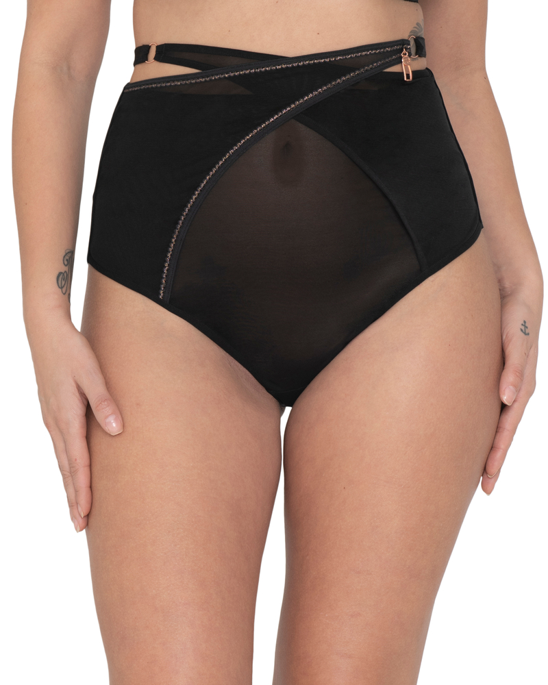 Необычные трусики с высокой посадкой. Талия дополнена эффектной деталью с кружевной имитацией молнии. Задняя часть модели выполнена из двойной сетки.