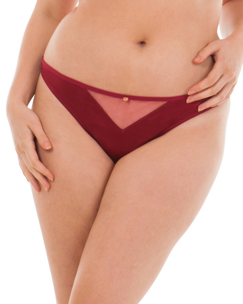 Классические трусики-стринги в красном цвете и лёгкой прозрачной вставке в передней части модели.