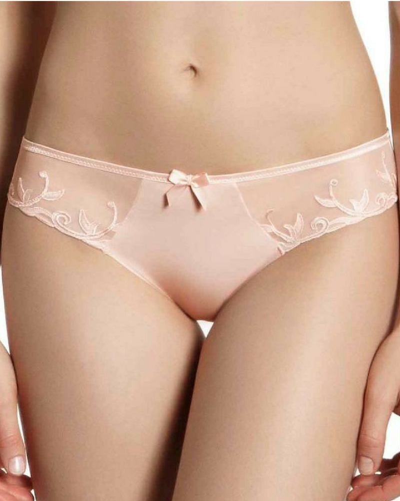 Классические трусики персикового оттенка выполнены из мягкой, бархатистой ткани и дополнены нежным кружевом на сетке.